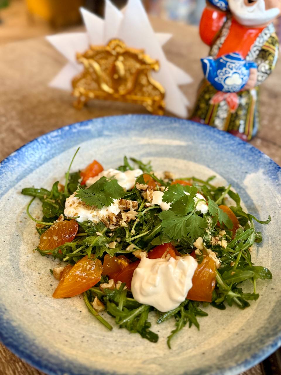 Нежный салат из хурмы, сливочного сыра, руколы и грецкого ореха